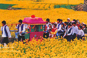 白族维系一夫一妻婚姻制,同姓同族不通婚。订婚要测算生辰八字,财礼较厚重。新娘到了男方家门,要“退喜神”,即由两人持火把在新娘周身晃过,也称“退马车”。新郎新娘在堂前拜礼,新娘要依次先后敬苦茶、甜茶、泡酒,蕴含人生苦尽甘来的意味。次日新婚夫妇回门,女方父母送以家畜家禽。当天要返回男方家。