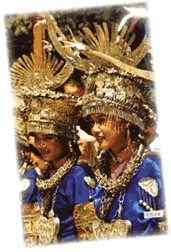 胸牌:汉语称“压领”,是悬于胸前的银牌。用一块银片,以模型压成花纹雏坯,细钻花纹。其下沿焊接许多银链,每根银链的下端焊接银铃、银喇叭等若干件。银牌上沿焊接一根较粗且长的银链,戴在脖子上。
