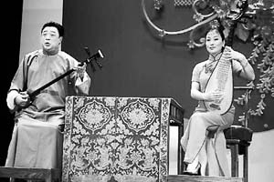 静下心来认真地一想:哦,来苏州快一个星期了,那多年来一直让我梦萦情牵的苏州评弹竟还没有听到。于是,文友们陪伴着我,满城去找旧时说书的场子。说来也真是奇怪,以往曾遍布苏州城乡的演唱评弹的茶馆,如今却成了凤毛麟角。临近中午,才子才女们懒洋洋地在盘门附近的一座公园里徜徉。忽然,耳畔隐隐传来阵阵琵琶弦声,循声望去,不远处一个青堂瓦舍的建筑里,人头攒动,正是一个说书场子。我们赶到那里时,却正赶上散场,观众流水般顷刻走得干干净净。只见两位评弹演员正在边喝茶,边聊天。那年轻的女演员梳着披肩长发,上身着碎花蓝布滚边对襟衫,下身是同样质地的拖地长裙。她一边摇着手中精制的丝绸花扇,一边用那双会说话的大眼睛微笑地看着我们。听我们说明来意,那女演员站起身来说:“难得各位有这样的雅兴,那么我就和师兄破例为大家唱回专场吧。”
